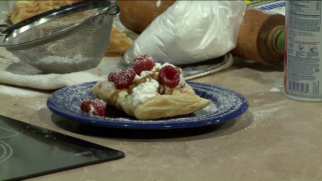 NOTE: If you don’t have a waffle iron, a panini grill will also work. If you don’t have either, cut the puff pastry into four equal rectangles before filling. Proceed as above, then place the filled rectangles on a baking sheet. Cook in a preheated 375o oven for about 10 minutes, until golden brown.