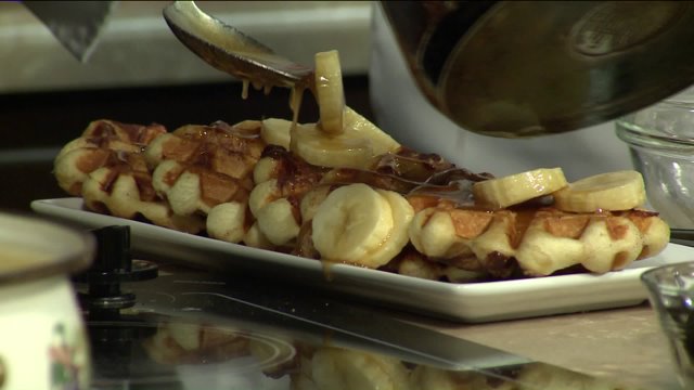 Cinnamon Roll Waffles with Banana Fosters Sauce