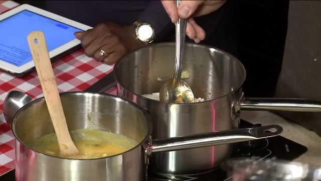 - Add the potatoes, kale and stock.