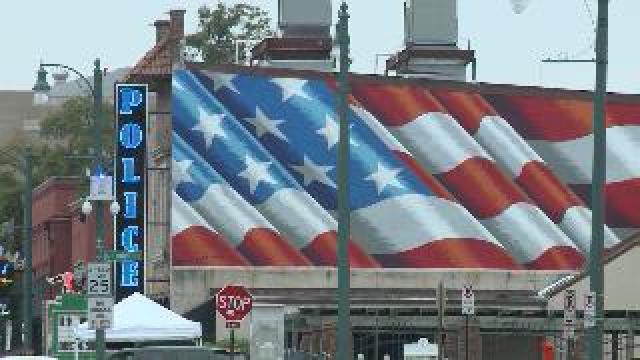 A huge American flag has been painted on the Downtown Police Precinct there.
