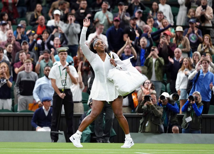Serena Williams of the US waves as she leaves the court after losing to France's Harmony Tan in a first round women’s singles match on day two of the Wimbledon tennis championships in London, Tuesday, June 28, 2022. (John Walton/PA via AP)