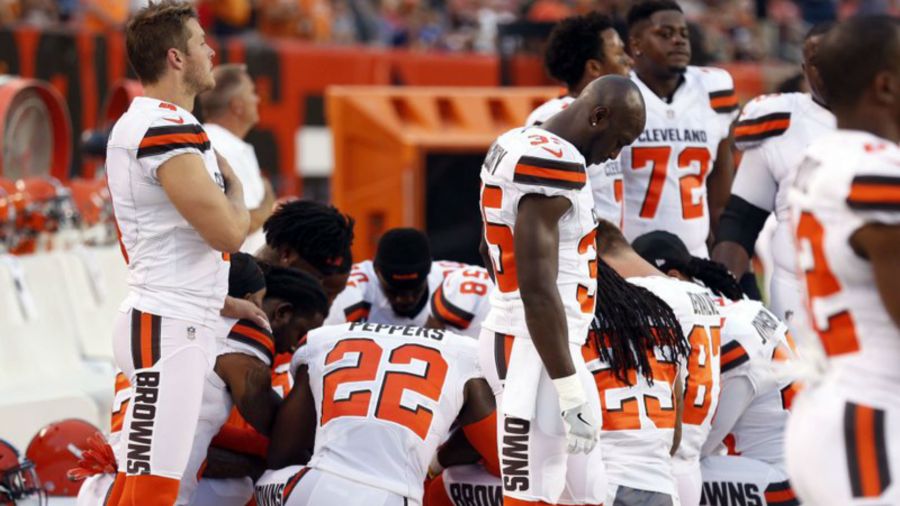 Nearly a dozen Browns players knelt in a circle and prayed in silent protest during the anthem before a preseason home game Aug. 21 against the New York Giants. A smaller group of players placed hands on the shoulders of their kneeling teammates.
