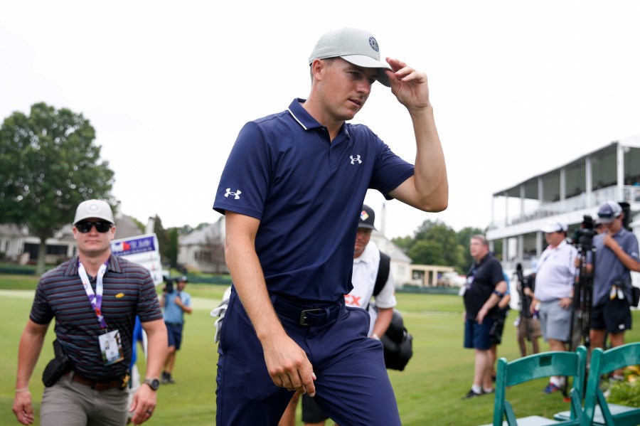 Jordan Spieth walks off the 18th hole after finishing the first round of the FedEx St. Jude Championship golf tournament at TPC Southwind in Memphis, Tenn., Thursday, Aug. 10, 2023. (Chris Day/The Commercial Appeal via AP)
