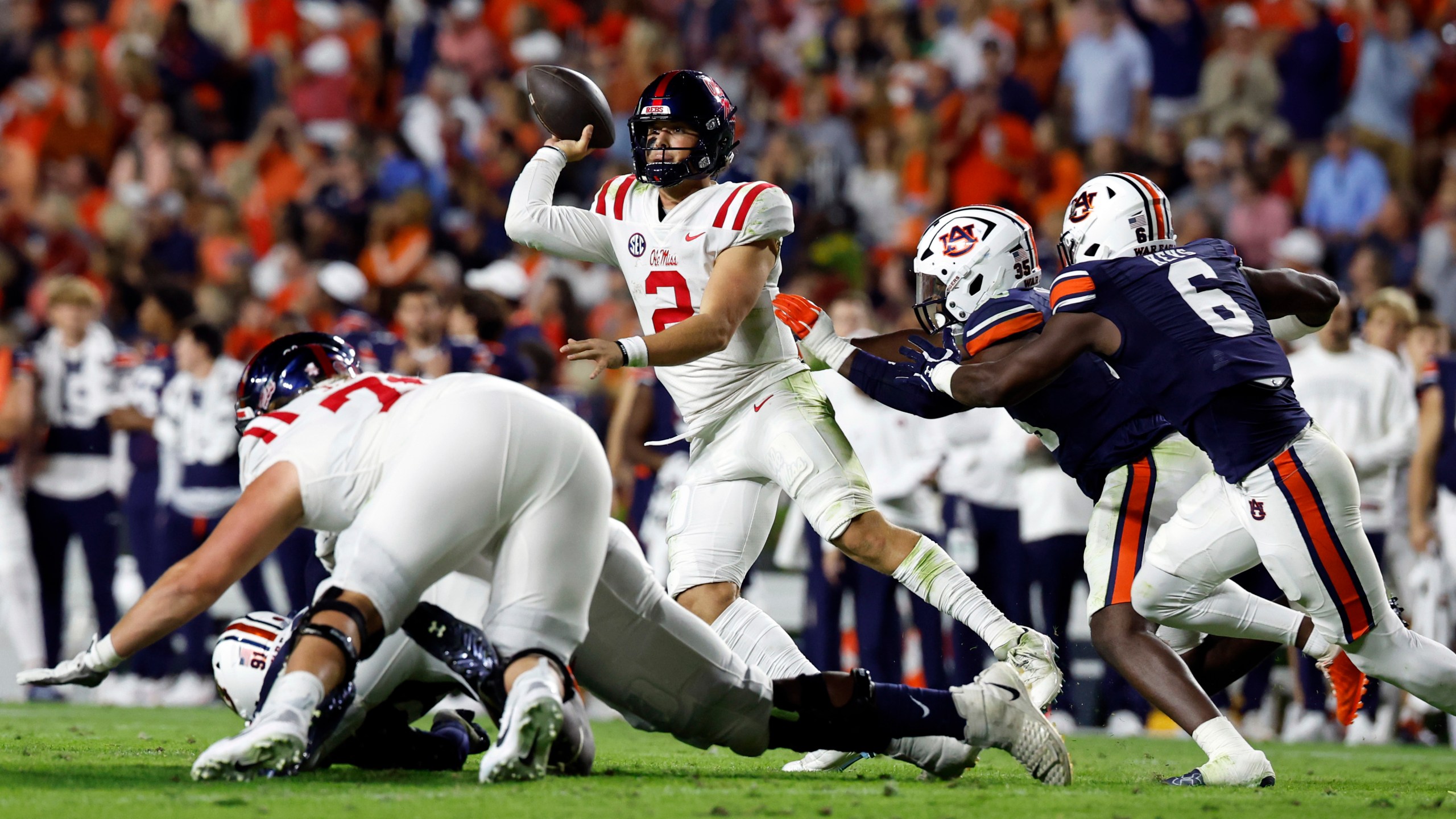 AUBURN, Ala. — Jaxson Dart had 246 yards of offense and three touchdowns to help No. 13 Mississippi beat Auburn 28-21 on Saturday night. Dart led the Rebels (6-1, 3-1 Southeastern Conference) to touchdowns on their first two drives before plunging into the end zone from a yard out on the final play of the third quarter for a lead Ole Miss held onto. Quinshon Judkins added 124 yards rushing and a fourth-quarter touchdown run for the Rebels. Tre Harris had 102 yards receiving. Auburn dropped to 3-4 overall and 0-4 in the SEC.
