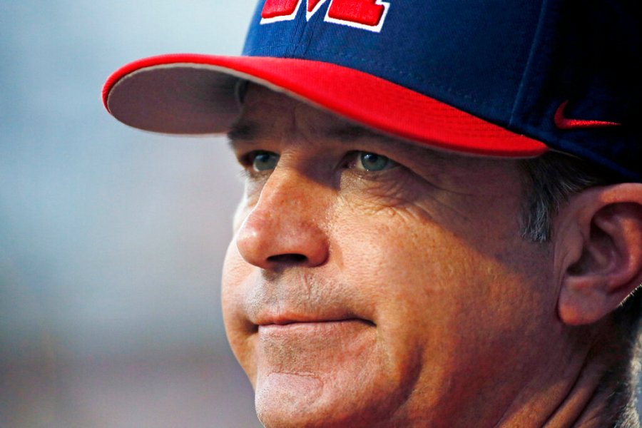Mississippi coach Mike Bianco watches in the third inning of an NCAA college baseball game against Mississippi State in Pearl, Miss., Tuesday, April 22, 2014. (AP Photo/Rogelio V. Solis)