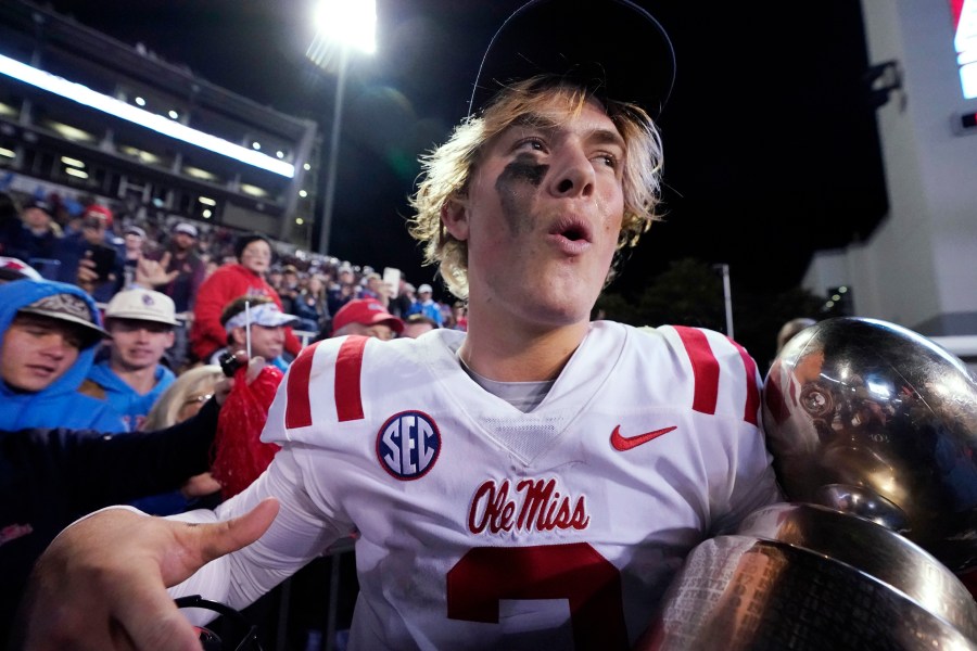 Mississippi quarterback Jaxson Dart (2) celebrates the team's win over Mississippi State in an NCAA college football game in Starkville, Miss., Thursday, Nov. 23, 2023. The winners receive the Golden Egg trophy. (AP Photo/Rogelio V. Solis)