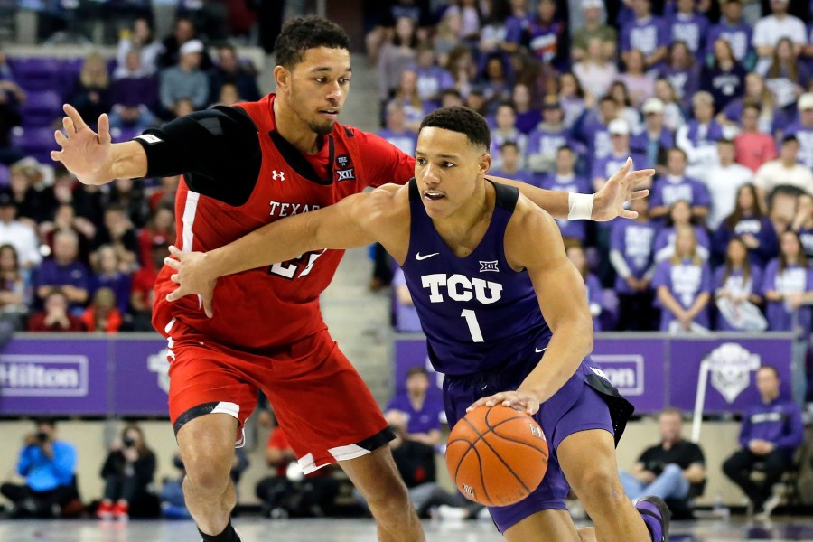 FILE - In this Nov. 18, 2020, file photo, TCU guard Desmond Bane, right, drives to the basket as Texas Tech forward TJ Holyfield defends during the second half of an NCAA college basketball game in Fort Worth, Texas. Bane was selected by the Boston Celtics in the NBA draft Wednesday, Nov. 18, 2020. (AP Photo/Ray Carlin, File)
