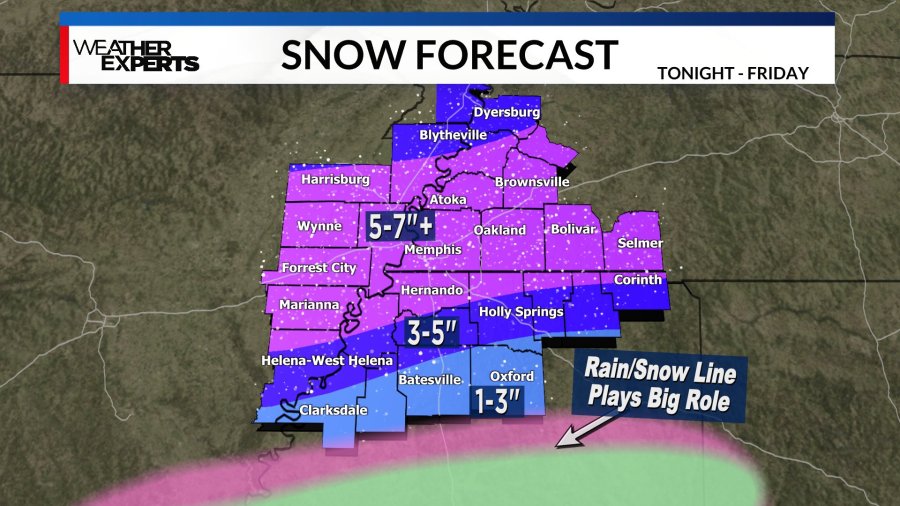 We’re still on track for a large swath of 5-7”+ along the I-40 corridor down into northern Mississippi, especially for areas closer to the state line. Deeper into northern Mississippi there’s likely to be some periods of sleet, freezing rain, and possibly even straight rain.