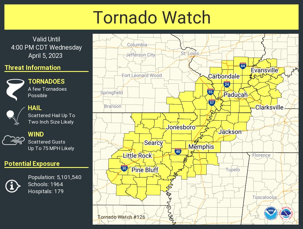 A Tornado Watch has been issued in Arkansas for the Craighead, Dunklin, Greene, Poinsett and Clay counties until 9:00 a.m.
